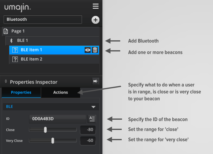 Starting with version 1.4.2 of Umajin App Builder you can now use our BLE component for creating beacon proximity experiences – and new actions for sending and receiving commands. We are working with Intel and WPP on a cool innovation kit which includes an Intel Edison CPU and a whole range of additional hardware elements which can be controlled by your Umajin mobile application!